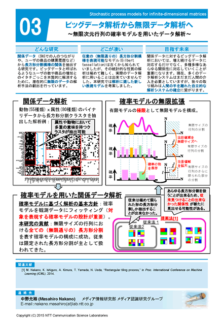 ソーシャルネットワークでの人のつながりや、ユーザの商品の購買履歴などの関係データは、今膨大に増え続けているビッグデータの一つである。このような関係データから長方形分割模様の関係性を抽出する技術が盛んに研究されているが、従来、その抽出出来る分割の形に強い制約を受けてしまうことが問題となっていた。本研究は、その問題を解決し、あらゆる分割を抽出することの出来る技術を生み出す事に成功した。これは従来発見出来なかった新しい関係性(ユーザの購買パターンなど)を見出すことが出来る可能性を持っている。さらに本発表では、提案する枠組みが無限に増え続ける関係データへの無限データ解析に繋がっていることも併せて述べたい。