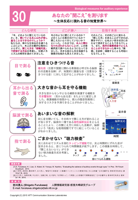 複数の音のうち、今どれを聞いているか? 何にどのくらい注意を向けているか? 聞こえないふりをしているのか? ・・・ これまで聞いている本人に直接尋ねなければわからなかったことが、「脳波」だけでなく、「目」「耳から出る音」「指運動」といった身体の意外な反応に表れることがわかりました。その具体例をご紹介します。聞き取りやすい音の設計、既存の聴覚検査でとらえることのできなかった様々な「難聴」を診断・補聴する技術の開発につながります。