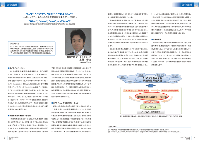 センサの信頼性、耐久性、給電技術の向上などに後押しされ、社会インフラ、医療、ヘルスケア、交通、農業などのあらゆる領域がセンサに覆われ、大量のデータが収集、分析可能になりつつあります。いわゆる「モノのインターネット(IoT: Internet of Things)」化が加速しています。機械学習・データ科学センタでは、「いつ」「どこで」「何が」をリアルタイムに予測し、社会システムにフィードバック可能な技術として、「時空間多次元データ集合分析」の研究開発を新たに立ち上げました。本講演では、当該技術について紹介します。
