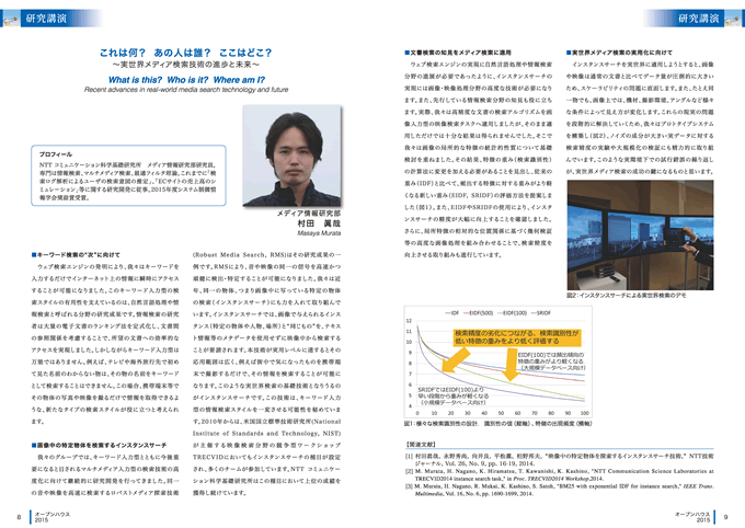 インスタンスサーチと呼ばれる画像や映像からの特定物体の探索の研究に取り組んでいます。インスタンスサーチでは、特定物体が映る画像や映像を問い合わせとし、テキスト情報等のメタデータには頼らずに、その物体が映るメディアを探索します。本技術は、例えば街中で気になったものを携帯端末で撮影してそれに関する情報を得るなど、実世界と情報世界を結ぶかけ橋となる可能性を秘めています。本講演では、インスタンスサーチに関する研究の経緯を振り返りながら技術のポイントを紹介し、将来の発展を展望します。