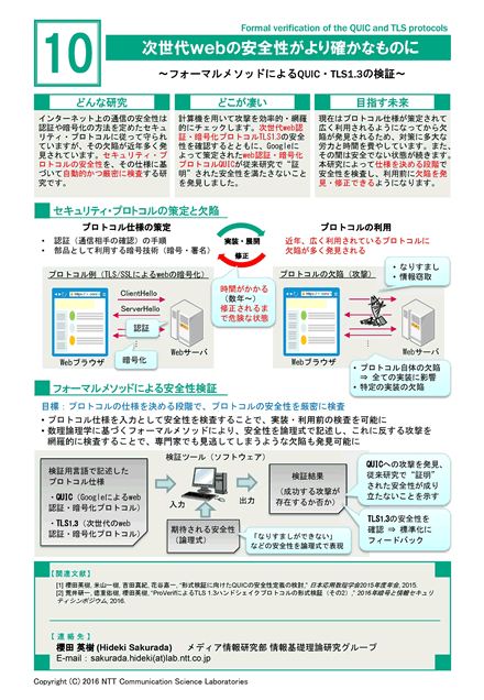 インターネット上の通信の安全性は、認証や暗号化の方法を定めたセキュリティ・プロトコルに従って守られています。しかし近年その欠陥がたびたび発見されています。対策までの間は危険な状態が続くとともに, 対策には多大なコストを要します。本研究では、数理論理学に基づくフォーマルメソッドを利用し、プロトコルが与えられた安全性を満たすかどうかを計算機を用いて厳密に検査することで、プロトコルが利用される前に欠陥を発見します。特に、次世代web認証・暗号化プロトコルTLS1.3の安全性を確認し、さらに、Googleによって策定されたweb認証・暗号化プロトコルQUICが従来研究で証明された安全性を満たさないことを発見しました。