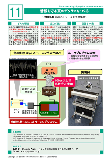 究極の安全性を保障する暗号技術の実現には、物理乱数が必要です。特に、近年、重要性が増している大規模データの暗号化には、高速な物理乱数生成技術が求められます。これまで、我々は、レーザカオスを使えば、Gbpsを超える高速な物理乱数生成が可能であることを実験的に示してきました。しかし、レーザカオスから生じる不規則信号(=アナログ信号)を、リアルタイム処理で物理乱数列(=デジタル信号)に変換するシステムは、これまで存在しませんでした。これに対し、レーザカオスと高速AD変換器、高速処理システムを融合させることで、物理乱数列を高速に生成し、ストリーミング供給できるシステムを世界で初めて実現しました。