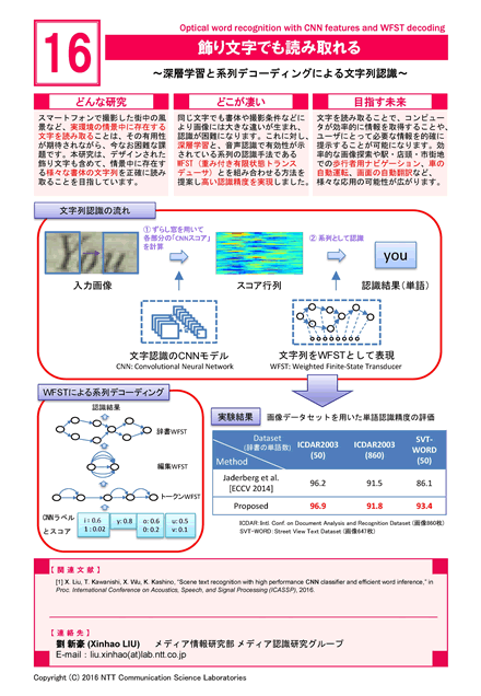 スマートフォンで撮影した街中の風景など、実環境の情景中に存在する文字を読み取ることは、その有用性が期待されながら、今なお困難な課題です。同じ文字でも書体や撮影条件などにより画像には大きな違いが生まれ、認識が困難になります。これに対し我々は、画像認識で有効性が示されている深層学習(CNN)と、音声認識で有効性が示されている重み付き有限状態トランスデューサ(WFST)を組み合わせた手法を提案し、高い認識精度を実現しました。文字を読み取ることで、コンピュータが効率的に情報を取得することや、ユーザにとって必要な情報を的確に提示することが可能になります。