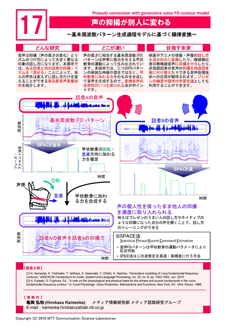 音声は抑揚に相当する基本周波数(F0)パターンやリズムのつけ方によって異なる印象の話し方になります。本展示では、ある話者と別の話者のF0パターン・リズムを混ぜることにより本人の声色は変えずに話し方だけを変える音声変換技術を紹介します。F0パターンは声帯に張力を与える甲状軟骨の運動によって生み出されていますが、本技術では二つのF0パターンの単純な伸縮や混合ではなく、甲状軟骨に加わる力を合成して音声を生成するため、変換音声の自然性が常に保たれる点がポイントです。映画の俳優の話し方を自分好みに変えたり、非母語話者の音声の抑揚を母語話者風に付け替えたりできる音声処理技術や語学の学習支援として利用できます。