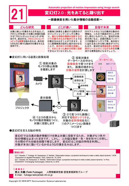 私たちは、プロジェクションマッピングで錯覚を誘導することで身の回りのものに様々な動きの印象を与える「変幻灯」の開発に取り組んでいます。この技術では投影対象と錯覚を引き出す投影パターンの位置合わせを正確に行う必要があり、これまではこの位置合わせに多くの手間と時間がかかっていました。今回、画像検索と姿勢 推定の技術を組み合わせることでこの問題を解決し、「カメラで対象を認識して動きのパターンを見つけ出し、位置を合わせて投影パターンを出力する」という一連の流れが自動で行えるようになりました。この自動化により、店舗や家庭で、誰でも簡単に変幻灯を利用することが可能になりました。