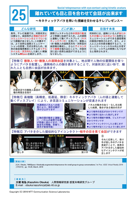 遠隔地間においても、あたかも対面しているかのような自然な会話を可能とする通信環境の実現を目指し、遠隔コミュニケーションの原理・方式を探るための実験システムMMSpaceを紹介します。これは従来の会話場再構成システムをリアルタイム化・双方向化したもので、1)複数人-対-複数人の遠隔会話を対象、2)高機動(高精度、低遅延、静音)キネティック・アバタにより、頭部ジェスチャや視線遷移などの非言語行動を強調して表現可能、3)アバタを介した擬似的なアイコンタクトが可能、としている点が特徴です。これら特徴により、離れた人とも対面状況により近い形で会話ができるようになりました。
