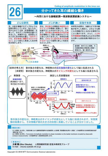 耳は、音を増幅するアンプのような役割を果たしています。私たちは、耳から出てくる音(耳音響放射)を使って、そのアンプの特性を調べてきました。その中で、耳は、単に音を増幅するだけではなく、音の強さの情報を神経発火のタイミングの情報に変換して脳に伝えているということが分かりました。この成果は、「耳は、音の強さの情報を神経発火の頻度(反応強度)の情報として脳に伝えている」という常識に一石を投じるとともに、人工内耳や補聴器の性能向上などの工学的な分野にも波及効果が期待されます。