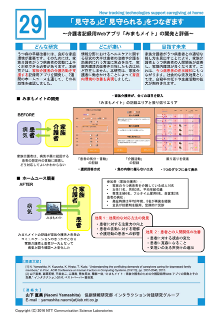 うつ病の早期改善には、良好な家庭環境が重要です。そのためには、家族介護者がうつ病患者の言動に上手く対処できる必要があります。本研究では、家族介護者の介護活動を支援する記録用アプリを開発し、6週間のホームユースを通して、その有効性を確認しました。具体的には、みまもメイトを用いることによって,家族介護者単独で病気を抱える患者に対処するという構図(家族介護者 vs. 患者+病気)から、患者と家族介護者が協調しながら病気に立ち向かうという構図(家族介護者+患者 vs. 病気)へと変化しました。本手法は、家庭内環境を改善することによって、家族介護者の負担を軽減すると共に、うつ病患者の症状緩和にもつながります。社会的な波及効果としては、自殺率の低下や生産活動の拡大が期待されます。