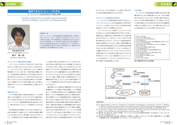スマートフォン上で対話システムが一般ユーザに用いられるようになってきたとは言え、対話システムによる日常会話(雑談)の実現はいまだ困難です。雑談に見られるような幅広い話題に対応するためには、任意の入力に対処できる「オープンドメイン言語処理技術」の進展が必要です。本講演では、一定の日常会話ができるまでに進展したNTTにおける雑談対話システムを中心に、オープンドメイン言語処理技術の実現に向けた取り組みを紹介します。また、オープンドメイン言語処理技術の実用化の例についても触れたいと思います。