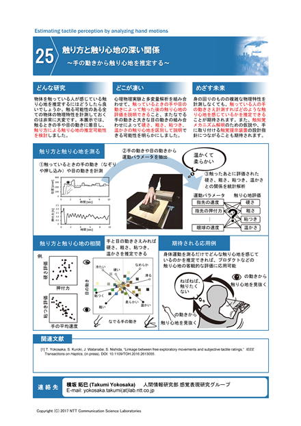 素材の粗さを感じるためにはなぞり、硬さを感じるためには押す、というように私たち人間は、手をさまざまなやり方で動かし、身の回りのものの触り心地を判断します。これまでの触覚研究の多くは、このような手の動きに着目することはありませんでした。本研究では手の動き、さらには目の動きから、その人が感じている触り心地を推定することを試み、それらが情報として利用できることを明らかにしました。これらの知見は、触知覚のメカニズムを明らかにする重要な手掛かりとなるだけでなく、腕や手に取り付ける触覚情報提示装置への設計指針を与えることが期待されます。