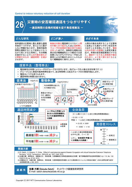 災害が発生すると安否確認の電話で電話網が渋滞(輻輳)状態になり、つながりにくくなります。現在の電話網では、警察・消防などの緊急呼の疎通確保と電話網の性能最大化のために発信数を規制しています(供給性能最大化を狙った対策)。輻輳対策としては需要削減の対策もあるはずですが、現在はユーザに電話をかけるのを控えてもらうよう御願いする音声ガイダンス以外は特になされていません。人間の行動を誘導して需要そのものを削減できれば今までには無い輻輳対策が可能となります。私たちは、発信可能時間帯のみを制限することで、ユーザに自ら通話時間を短縮させることができることを実験により明らかにしました。