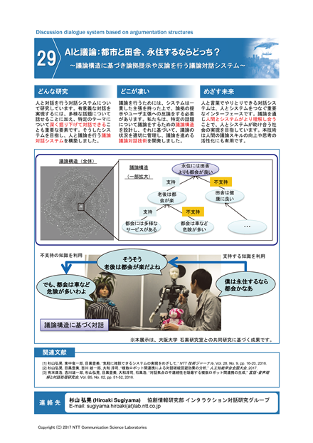 本展示では、人とディスカッションする議論対話ロボットのデモ展示を行います。NTTではこれまで、広い話題に応答する雑談システムの研究を進めてきました。しかし、より心地よい、有意義な対話を実現するには、特定のテーマについて深く掘り下げて議論することも重要です。議論対話システムを実現するため、私たちは、特定の話題に特化した深い知識構造と、議論の状態を適切に捕捉し続ける発話理解技術を確立しました。本展示では、大阪大学石黒研究室、NTT メディアインテリジェンス研究所と連携して構築した、リアルなアンドロイドとの議論を体験していただきます。