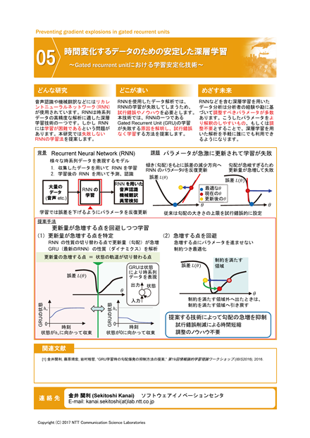 音声認識や機械翻訳などの時系列データを解析するリカレントニューラルネットワーク(RNN)の学習を安定化する技術です。RNN は深層学習技術の一つであり、時系列データを高精度に推定、解析できます。