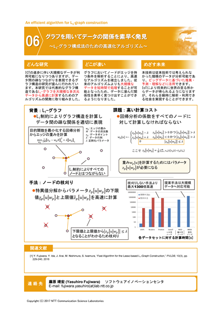 ICTの進歩に伴い大規模なデータが利用可能になっています。中でも、データ間のつながりをグラフ構造として表現し,解析する技術が盛んに研究されています。NTTでもグラフマイニングエンジン「Grapon」の研究開発を行ってきました。本研究では特に大規模なデータからL1グラフと呼ばれるグラフ構造を高速に計算するアルゴリズムに取り組みました。このアルゴリズムを用いることで大規模なデータを短時間で処理することが可能となり、データに潜んだ関係性を素早く見つけ出すことができるようになりました。大規模なデータに潜む関係性を高速に求めることでデータに基づいた推薦・予測・理解などに活用できます。