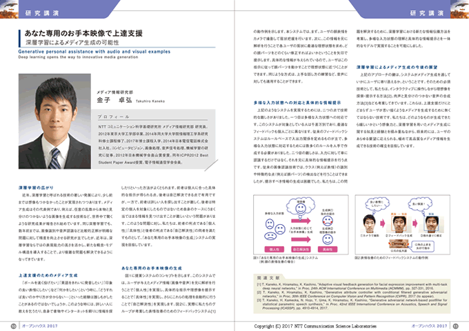 近年の深層学習の発展は著しく、少し前までは想像もつかなかったことが実現されつつあります。深層学習によるメディア生成はこのような技術の代表例であり、世界中で驚くような研究成果が報告され始めています。本講演では、まず、深層学習によるメディア生成の研究動向について説明します。そして、メディア生成のアプリケーションの中で私たちが着目している「上達支援のためのメディア生成」を題材に、従来技術の課題と私たちの取組みについて紹介します。 最後に、深層学習によるメディア生成の今後について展望します。