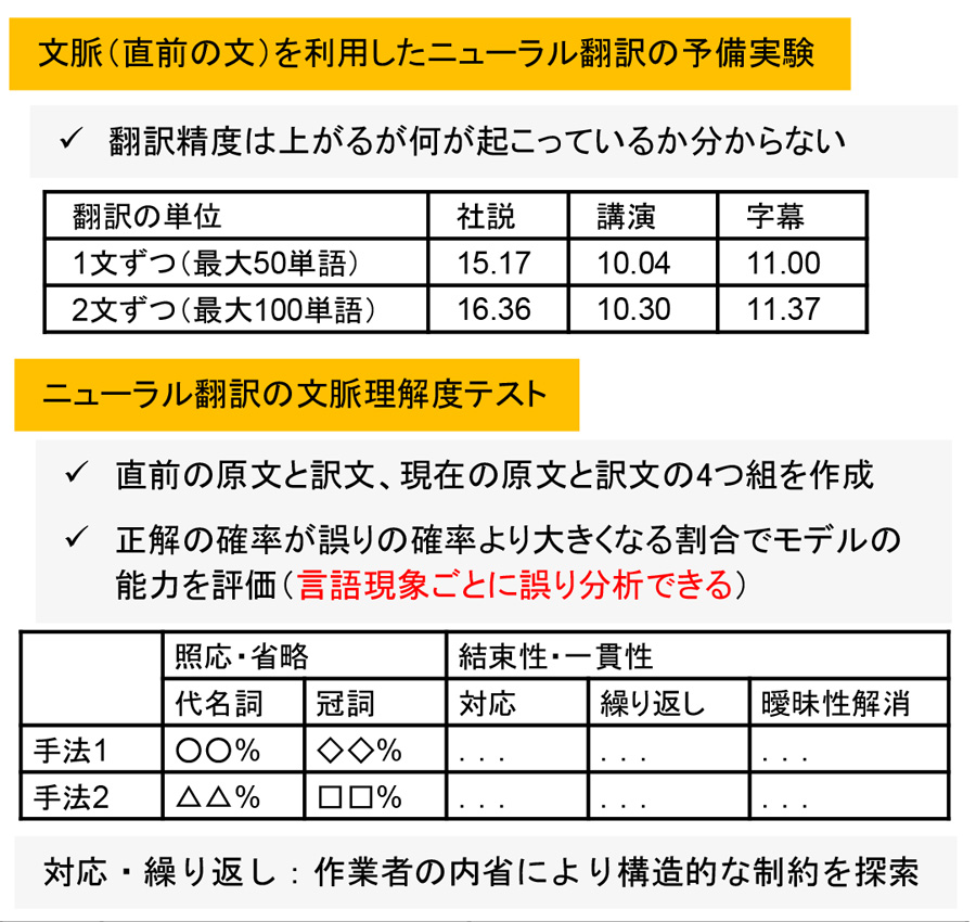 [1] M. Morishita, J. Suzuki, M. Nagata, “NTT Neural Machine Translation Systems at WAT 2017,” in Proc. The 4th Workshop on Asian Translation (WAT-2017), 2017. [2] R, Bawden, R. Wennrich, A. Birch, B. Haddow, “Evaluating Discourse Phenomena in Neural Machine Translation,” in Proc. The 16th Annual Conference of the North American Chapter of the Association for Computational Linguistics (NAACL-2018), 2018.