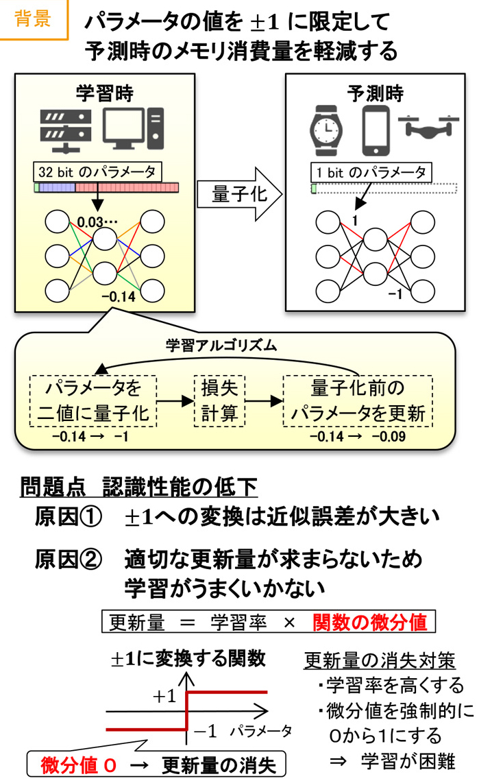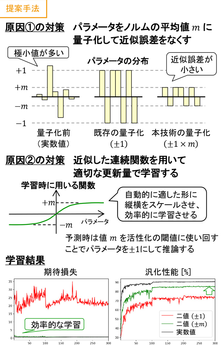 深層学習の連続値であるパラメータを±1に限定する量子化の影響を最小限にすると同時に効率的な学習アルゴリズムとすることで、従来手法よりも高精度かつ高速な量子化が可能となります。また、学習後にはビット演算で計算できるため、高速に予測できるようになります。