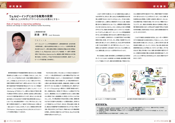 近年、情報通信技術(ICT)の著しい発展とともに、その心身への負の影響が指摘されています。そのため、機能性や能率性に代わる技術の評価指針として、ウェルビーイング(人や組織が持続的にいきいきと活動している状態)についての研究が盛んになりつつあります。本講演では、NTTコミュニケーション科学基礎研究所で検討が進められている、(1)人間科学に基づいた、ウェルビーイングを構成する要因の特定とその計測・モデル化について、(2)触覚に関する科学とデザインの発展について、(3)さらには他者の認知や他者との共感に触覚体験が及ぼす変容とウェルビーイングへの寄与について述べます。