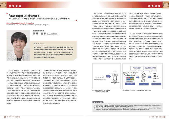 会社の従業員を同じ人数の2つのグループに分けたいとします。このとき可能なグループ分けは何種類あるでしょうか?可能なグループ分けの種類数は、従業員の数が増えると急激に増加していきます。このような現象は「組合せ爆発」と呼ばれます。コンピュータを用いて組合せ爆発を起こす問題を素朴な方法で解こうとすると、計算時間が膨大になり、現実的な計算時間で問題が解けなくなります。本講演では二分決定グラフとよばれる技術を用いて膨大な数の組合せを効率的に数え上げる方法、および数え上げることで何が分かるかを、いくつかの事例を交えて紹介します。