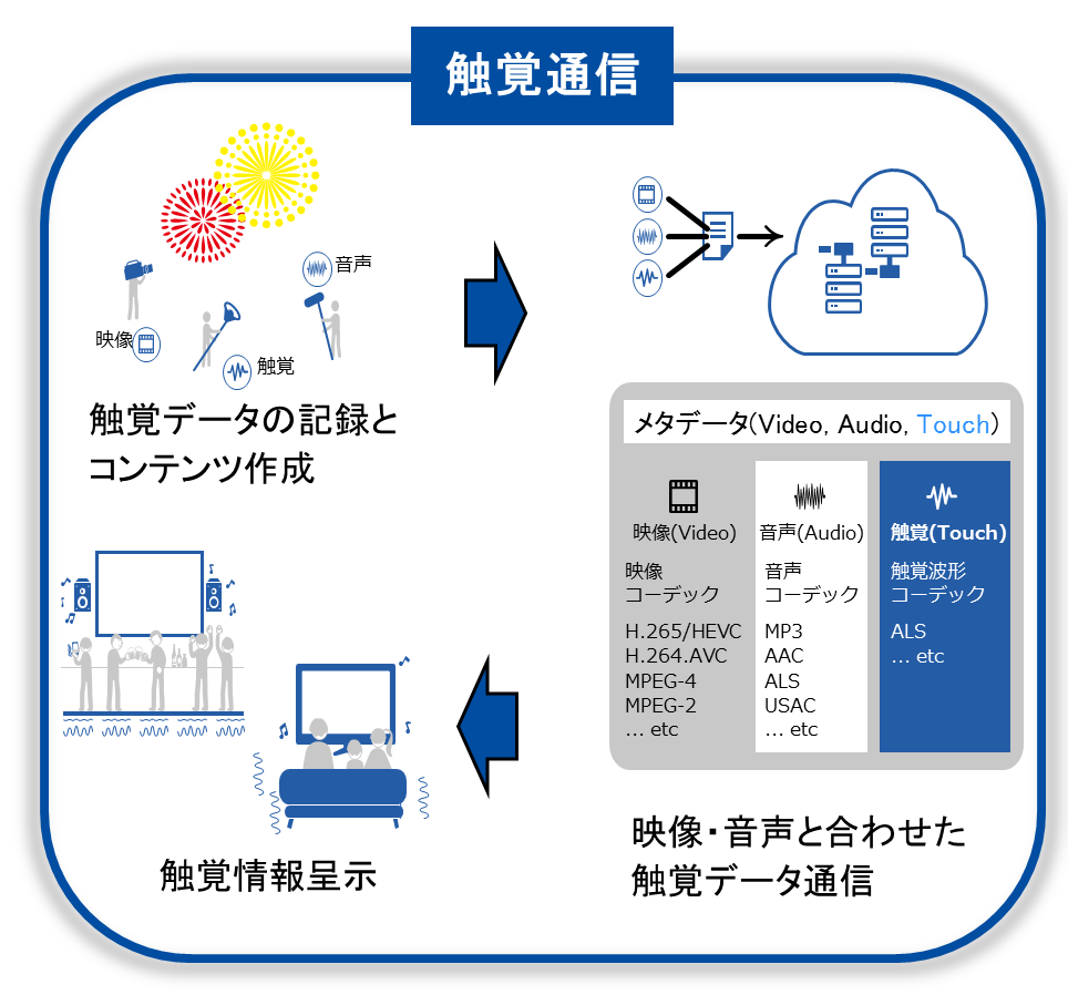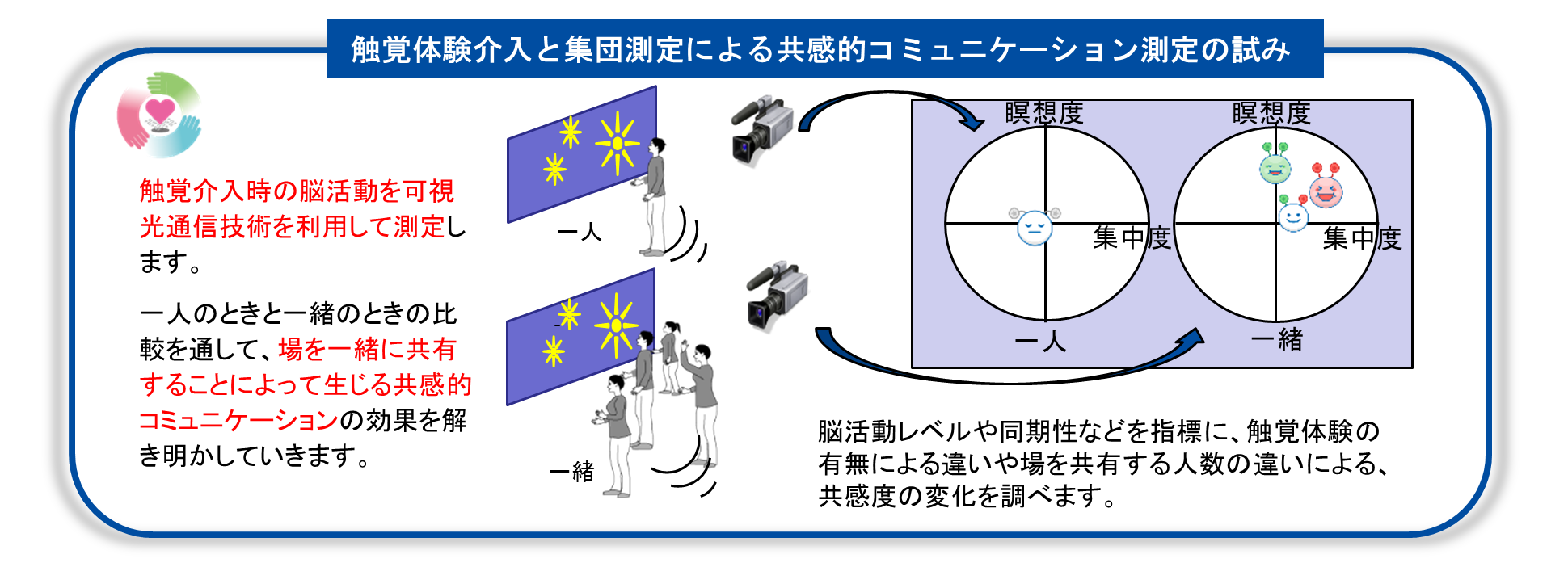 触覚情報を映像音と共に記録、配信、呈示する触覚通信の仕組みにより、体感を深めることにつながります。可視光通信により触覚体感を生理的な反応として多人数から同時に測定することが出来ます。異なる技術分野を組み合わせ共感的コミュニケーションに関する新たな研究を進めることが出来ます。