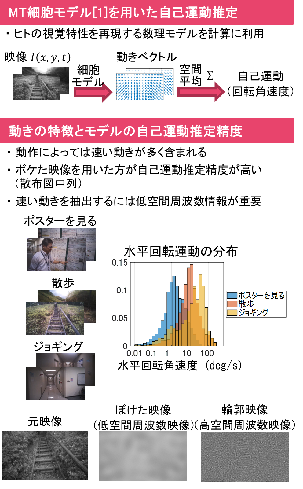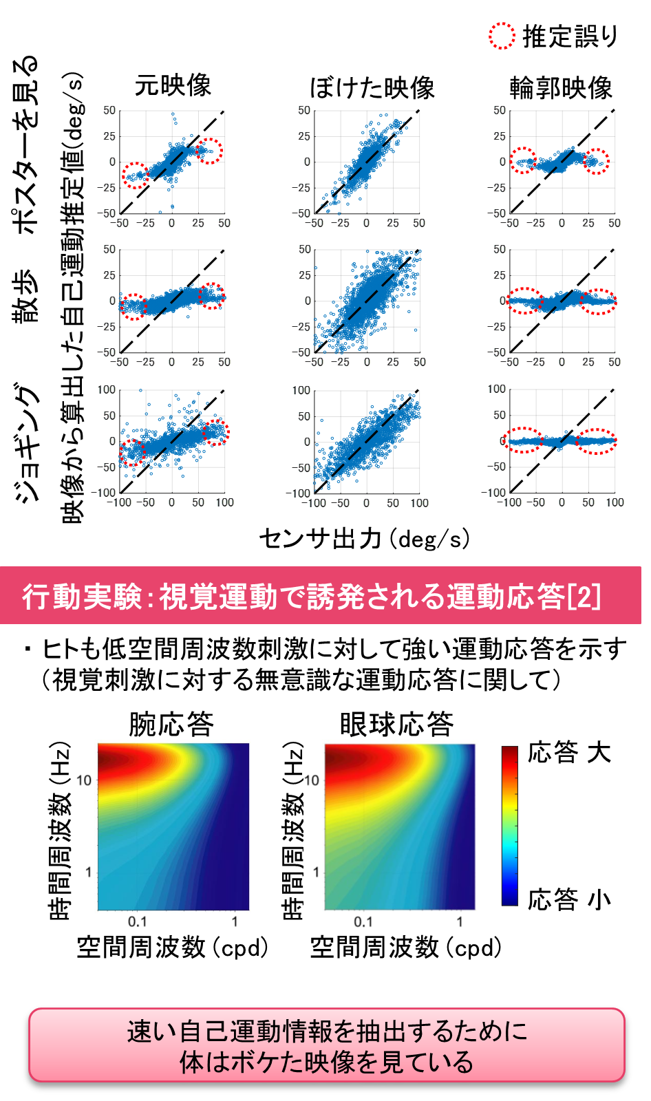 低空間周波数情報のみを取り出した映像(低空間周波数映像)は輪郭がボケた映像となり、何が映っているかよく分かりません。しかし、ボケた映像の方が元映像よりも算出される自己運動の推定精度が高く、また、ヒトの無意識な視覚―運動制御情報処理と類似しているという結果が得られました。