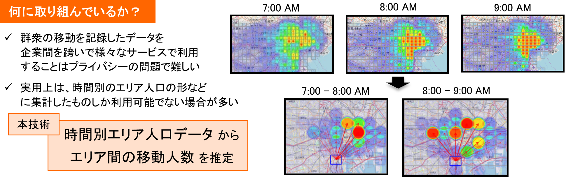 群衆の位置情報を解析する上で、時間別エリア人口データ(いつ・どこに人が何人いたか)が注目を集めています。本技術はそのような時間別エリア人口データから、人の移動の主な傾向(いつ・どこから・どこへ何人移動したか)を推定します。