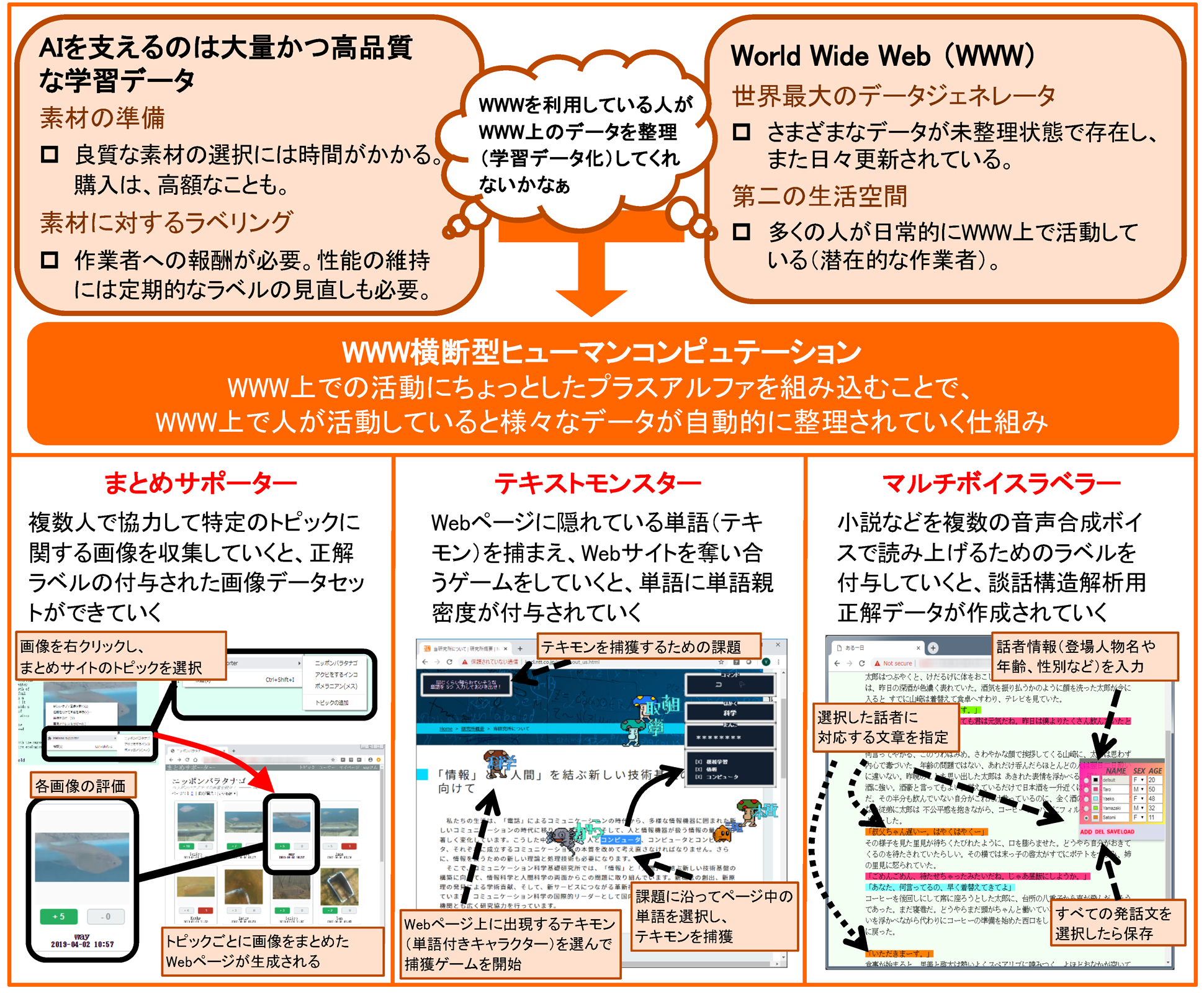 WWW上のデータをWWWの利用者自身が整理していくことができる本技術は、いわばクラウドソーシングの新たな形態を実現します。本技術によって機械学習用の学習データを作成できるようになれば、機械学習を利用した多種多様なサービスをより安価に創出できるようになるでしょう。