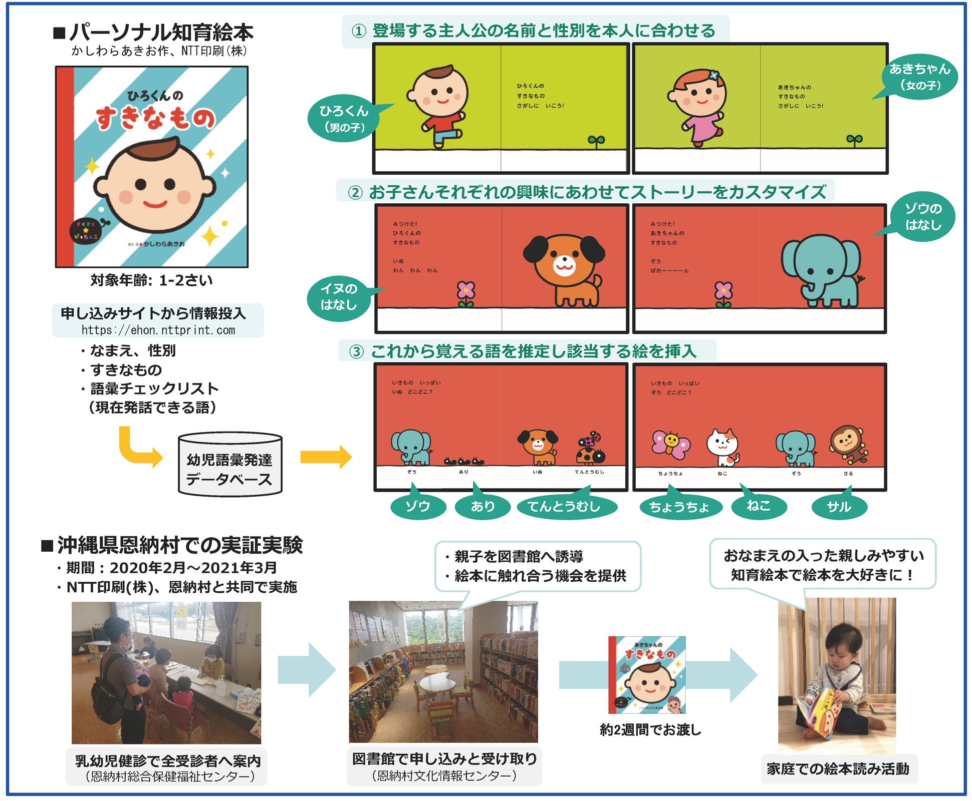 現在、沖縄県恩納村で乳幼児健診受診者に対し図書館でパーソナル知育絵本の受付と配布を行う実証実験を行っています。こうした取り組みからこの絵本の効果を探るとともに、図書館への来訪を促して絵本と触れ合う機会を増やすことにより、親子の絵本読み活動を後押しできるかどうかを検証しています。