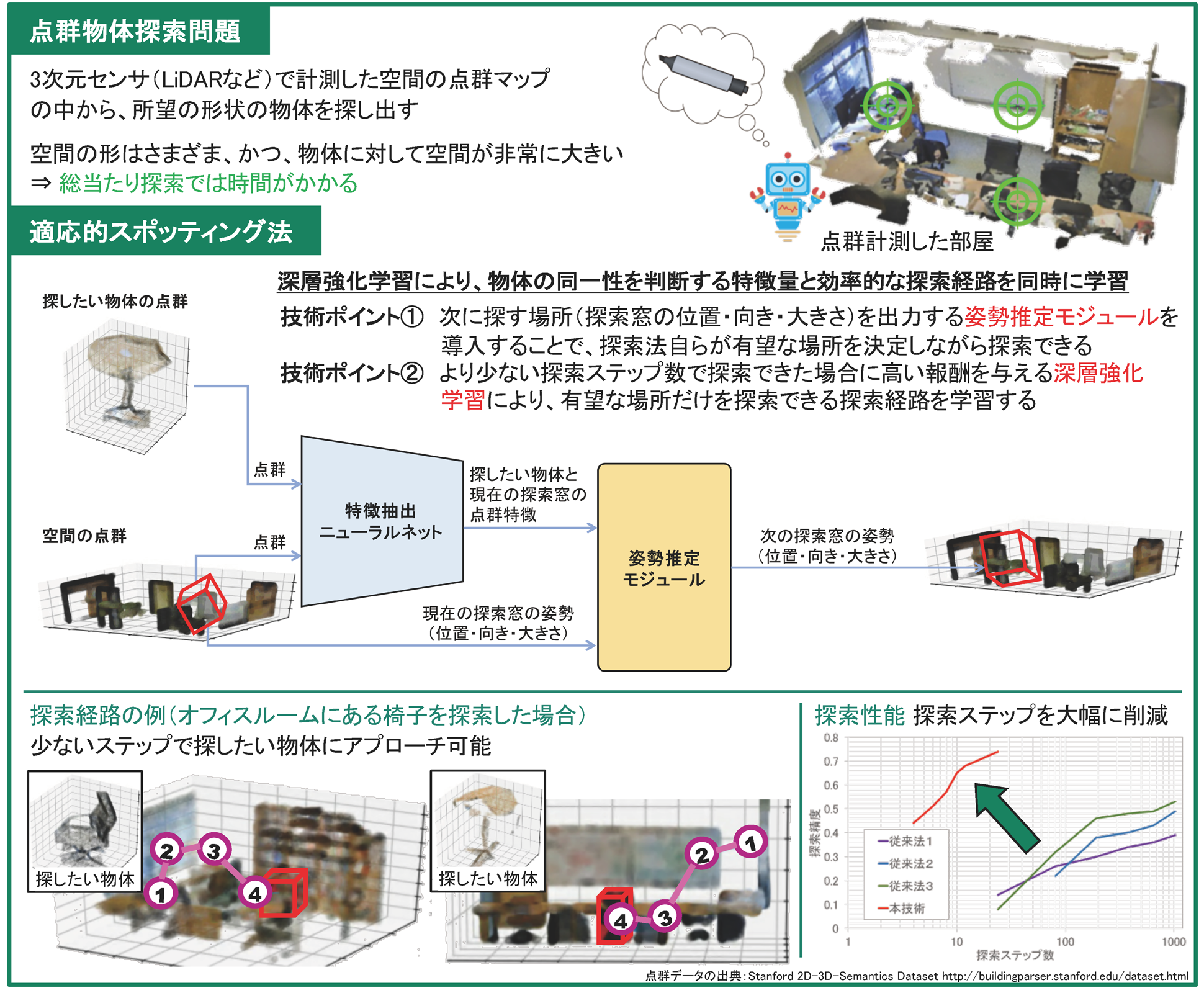 点群データにより3次元表現された実空間の中から、所望の形状の物体を素早く探し出す研究です。従来の物体探索技術は、総当たり探索を基本に、見込みのない場所だけをスキップする発想で高速化が図られてきましたが、それでもたくさんの場所を探す必要がありました。