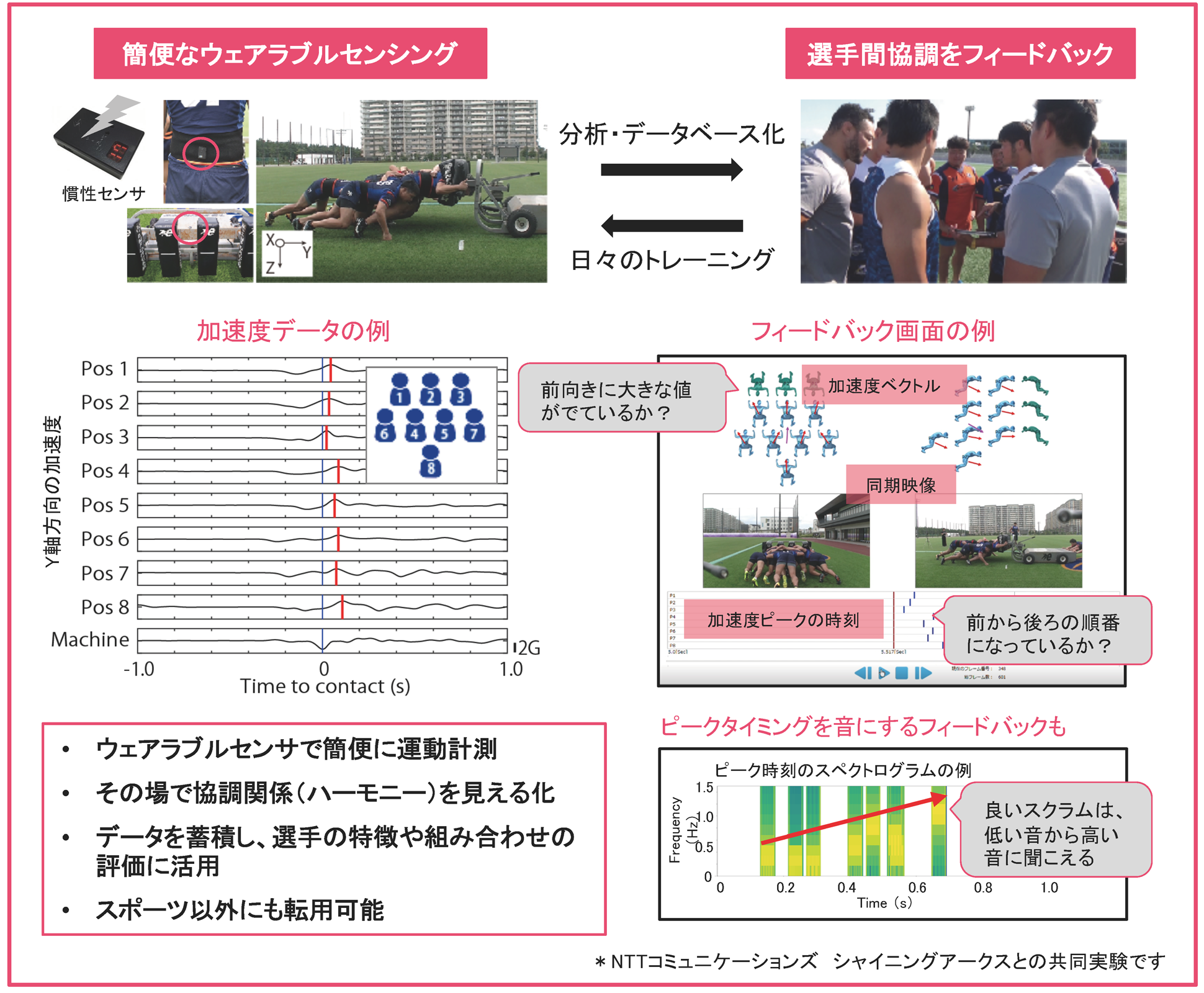 チームスポーツでは選手たちが協調してプレーすることが重要ですが、そうした協調性を評価することは容易ではありません。本研究では、ラグビーのスクラムを対象に、選手たちがいかに力を結集して相手を押しているか、その協調関係(ハーモニー)をウェアラブルセンサを用いて分析します。