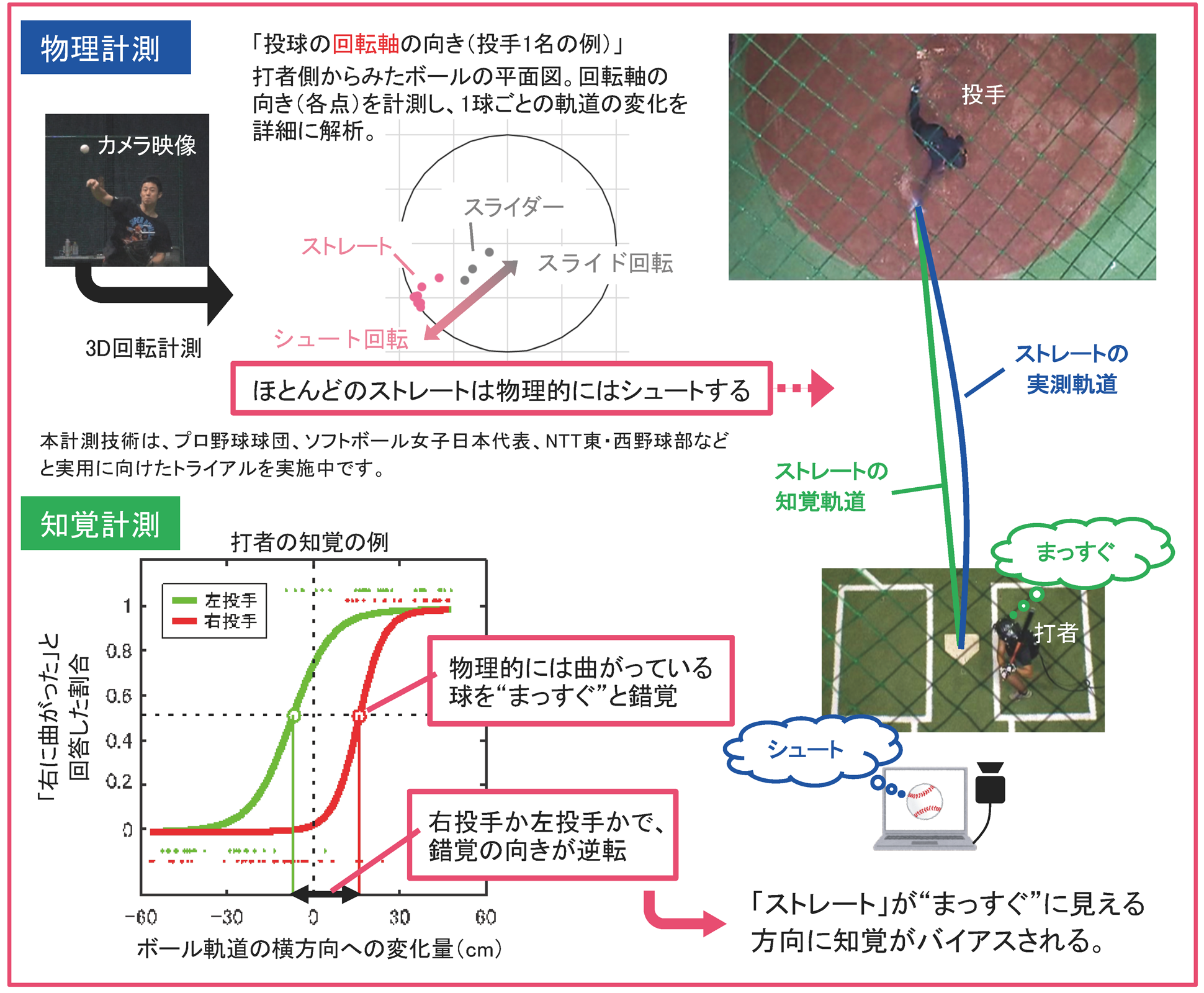 物理計測では、ボールの回転特性をカメラ一台から簡便に計測する技術を考案しました。それを元に知覚計測では、軌道の変化量に対して、打者は細かな違いを判別できるにも関わらず、系統的にズレて(錯覚して)知覚すること、また錯覚の方向が投球フォームによって変化することを発見しました。