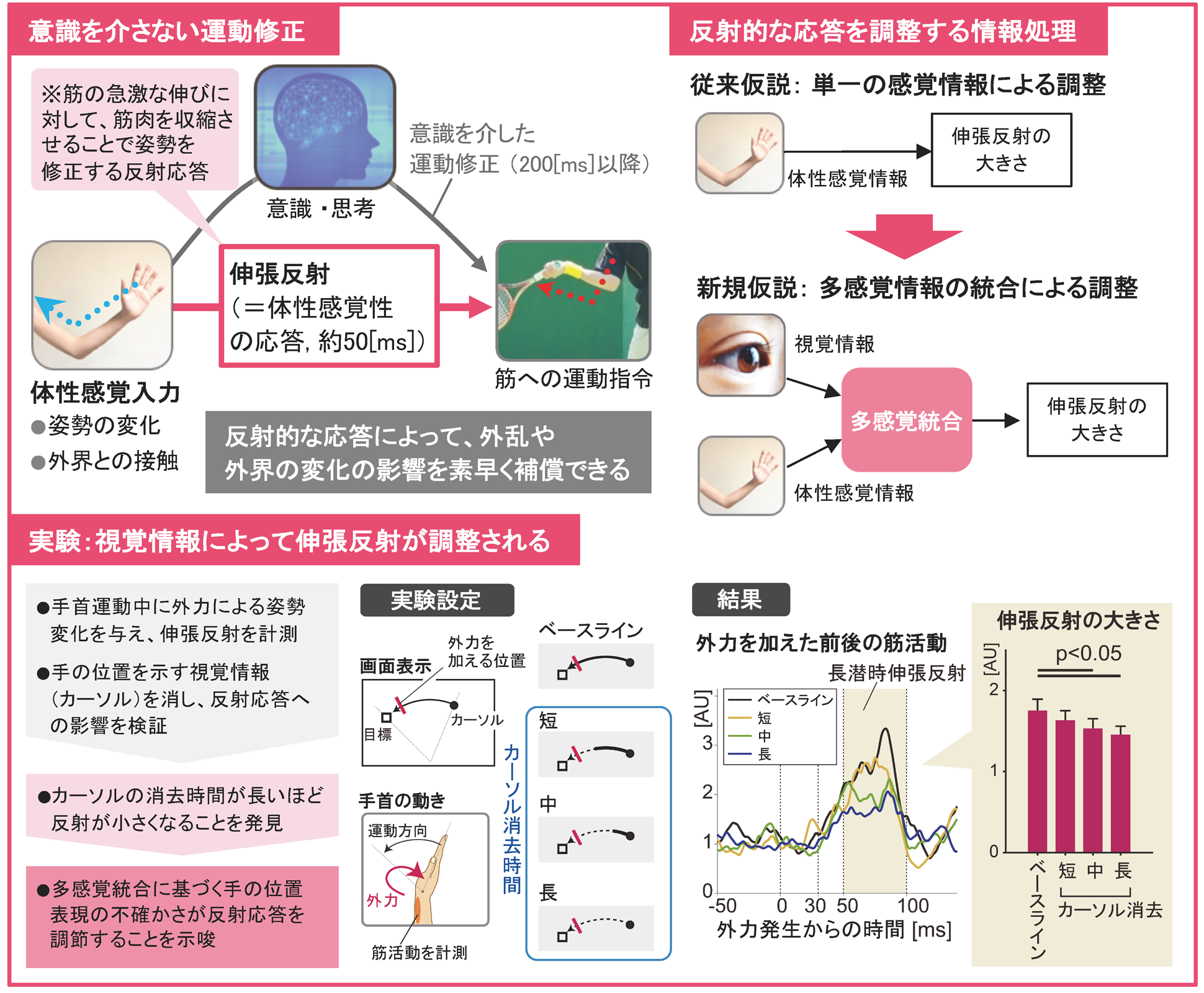 急激な姿勢変化を修正するように働く「伸張反射」が、自分の体の動きが見えない状況では小さくなることを発見しました。このことから、反射的応答の調節が、従来考えられていたように単一の感覚情報のみに基づくのではなく、複数の感覚情報を統合した身体表現を介し行われていると考えられます。