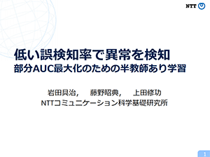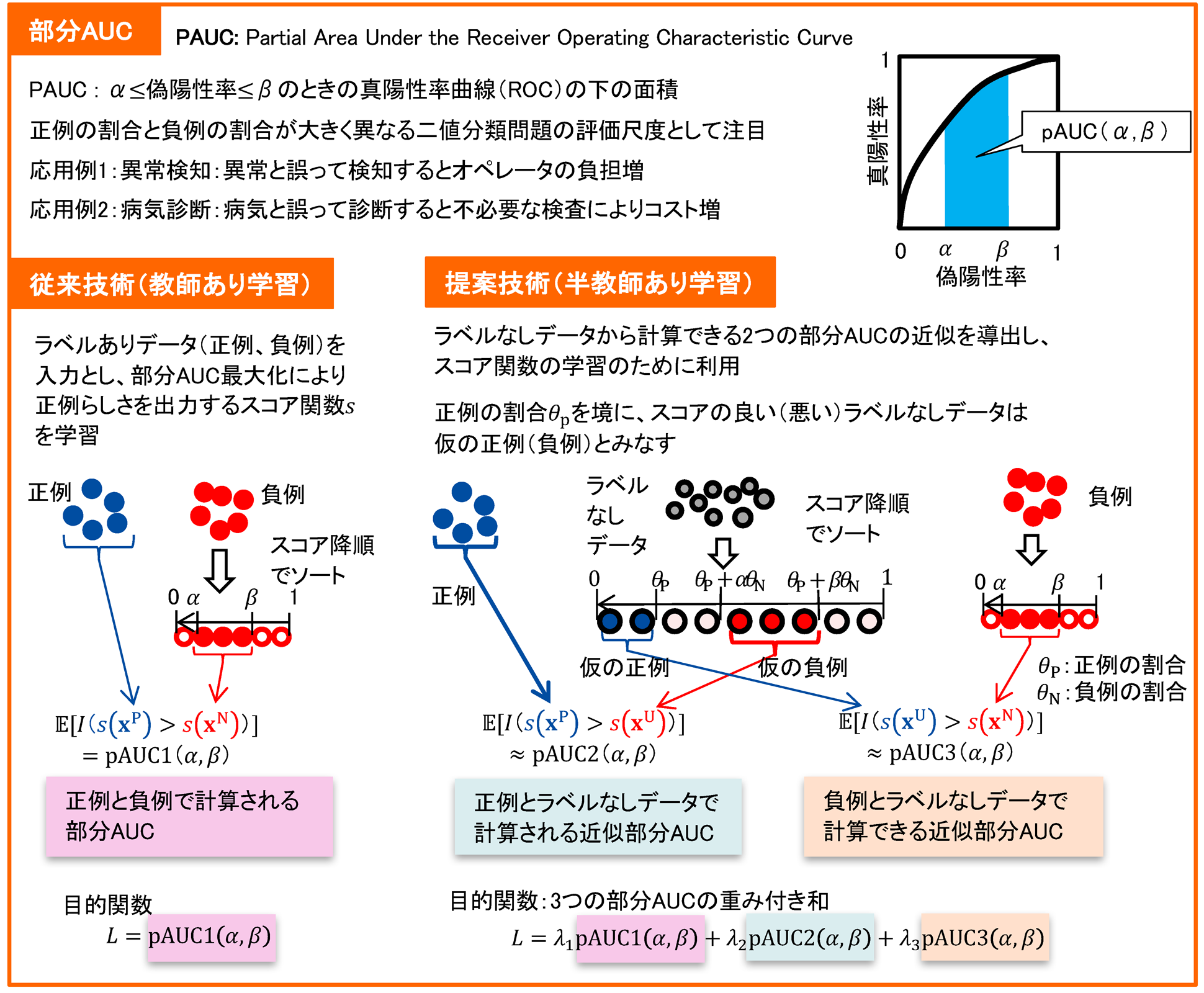 機械学習における二値分類問題において、ラベルなしデータを活用することによって、部分AUC(偽陽性率が特定の範囲での真陽性率)を高める分類器の学習方法に関する研究です。例えば異常検知において、誤検知率を低く抑えた状態で真の異常を見逃さなくすることが可能になります。