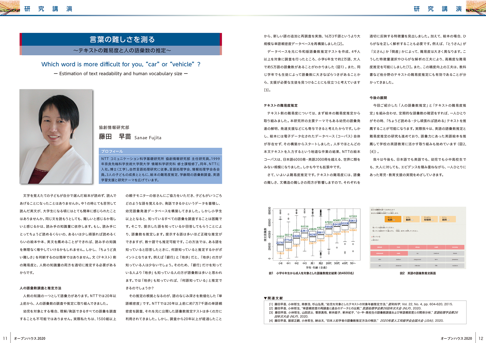 講演では、我々が取り組んでいる両方の推定方法をご紹介します。 テキストの難易度推定方法は、幼児向けのテキストから大人向けのテキストまで、幅広いテキストの難易度を推定できるロバストで汎用性の高い手法です。また、語彙数推定方法は、大人はもちろん、小学生から高校生といった学習過程にある子どもにも適用可能です。現在、これらを組み合わせた教育支援への取り組みを始めています。