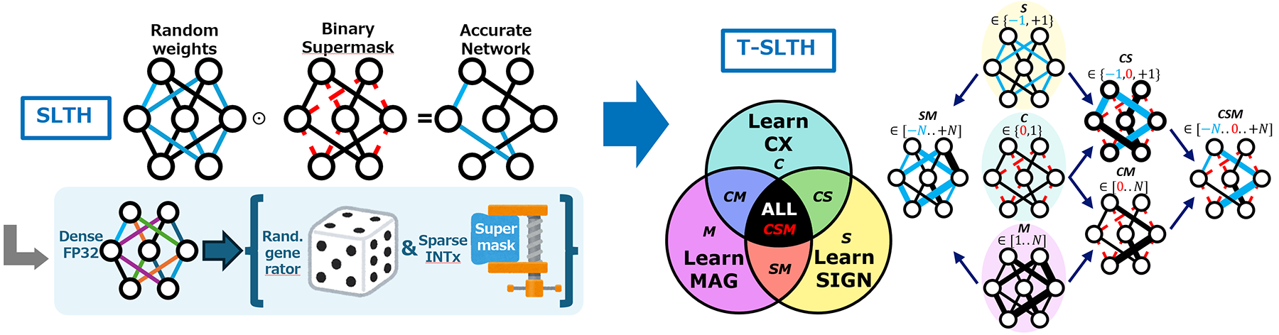 Pruning and quantization are common approaches in neural network compression. However, the Strong Lottery Ticket Hypothesis (SLTH) demonstrated that even before training, there exists a sparse subnetwork within a random initialization capable of achieving high accuracy. Instead of training the weights, a supermask is learned to determine active connections, allowing to reconstruct the network at inference time only from random seed and mask. Our research, the Trichromatic SLTH (T-SLTH), generalizes the SLTH into a new theoretical framework: trichromatic supermasks separately optimize three components of each weight—connectivity (C), sign(S), and magnitude scaling (M).