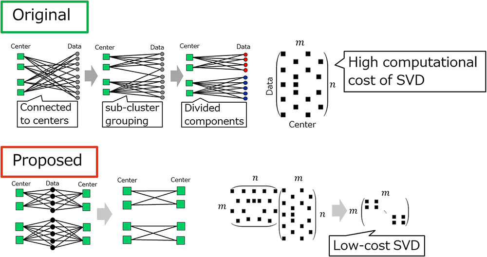 K-Multiple-Means performs sub-cluster grouping by repeatedly computing distances between cluster centers and data points and then partitioning a bipartite graph. However, since this requires computing SVD of the matrix representing the bipartite graph, the computational cost becomes high.
