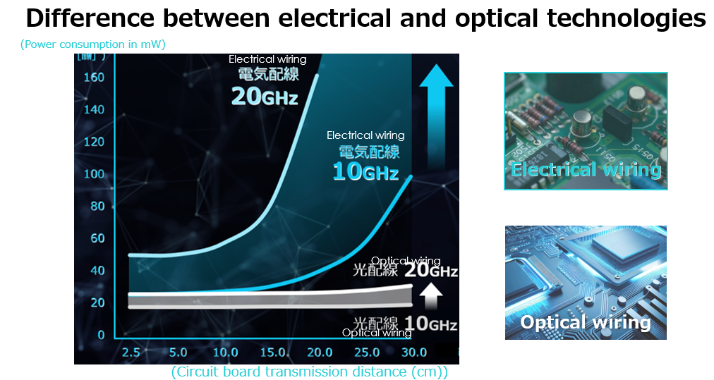 But with optical technology, even as the transmission distance grows longer and operating frequency rises, power consumption does not increase.