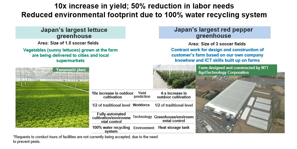 NTT AgriTechnology has set up Japan's largest lettuce greenhouse, the size of 1.5 soccer fields, for protected horticulture. We've succeeded in increasing yields more than 10-fold with half the traditional workforce.