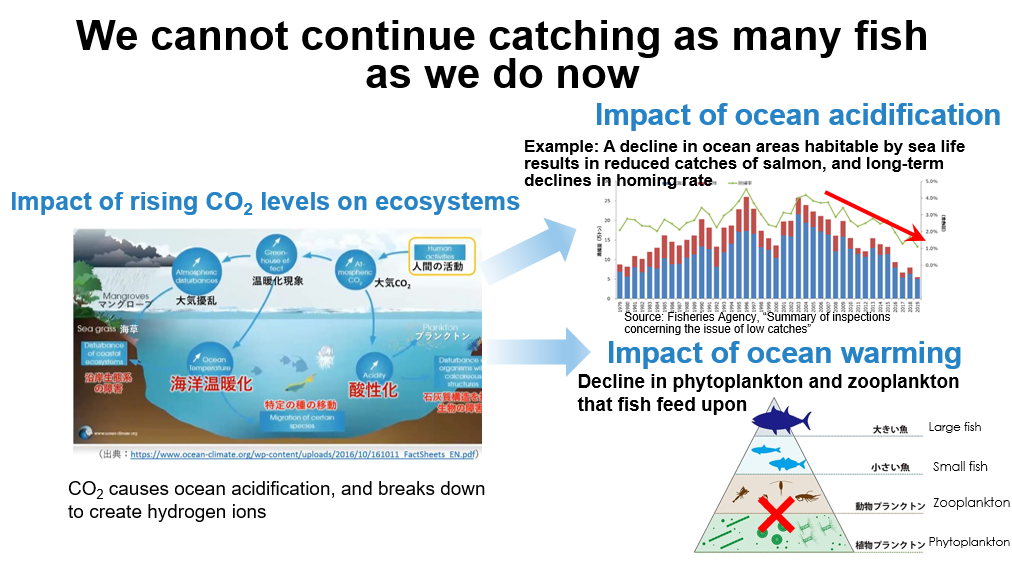 This acidification of the ocean is also causing declines in numbers of the phytoplankton and zooplankton that fish feed upon.