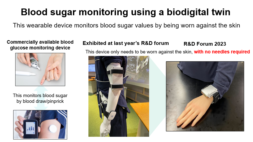 Here, Iʼd like to show you NTTʼs "wearable blood glucose sensor," a technology that enables the user to measure their blood sugar levels at any time, helping them understand what kinds of foods raise their blood sugar levels.