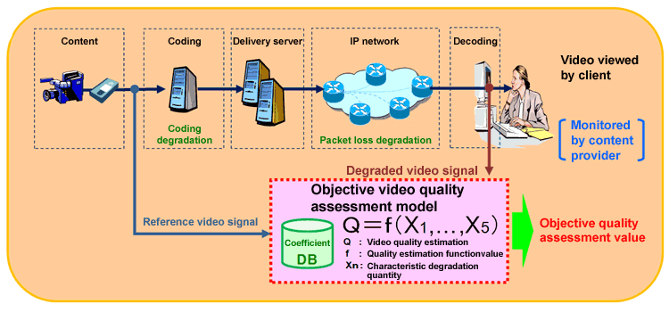 This model made it through a large-scale international technology competition in the ITU's Video Quality Expert Group (VQEG), and was selected as recommendation J.247. This model can evaluate video in which degradation has occurred due to the use of diverse coding schemes and bit rate conditions by video delivery services operating on IP networks, and due to packet loss (a characteristic of IP networks). This model makes it possible to automate the pre-delivery monitoring of quality in coded video content (a task which has hitherto relied on human eyes), thereby allowing video delivery services of suitable quality to be provided efficiently.