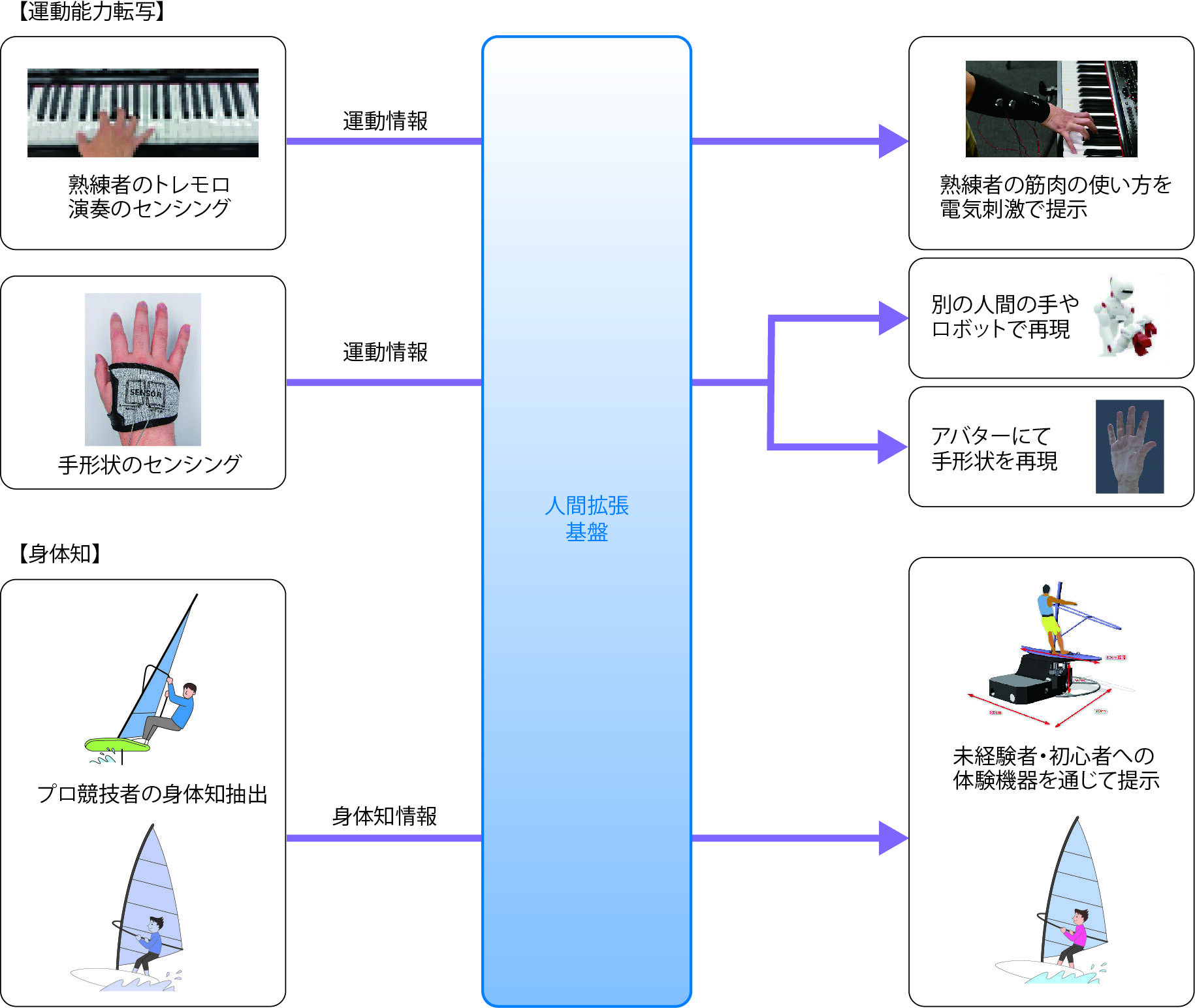 実現に向けて私たちが取り組んでいる研究開発の中から,プロスポーツ選手や職人の方が持つ技能・身体技術(コツなど)に対して,表面筋電や脳波のような客観的に観測できる情報を収集し,その情報を基に,筋電気刺激を用いて人に直接伝えるような伝達・共有をめざす「運動能力転写技術」と,その人自身の内で発生している主観的な感覚をとらえ,それと同様の感覚を他の人が自身の感覚として形成できるように伝達・共有をめざす「身体知技術」を紹介します.