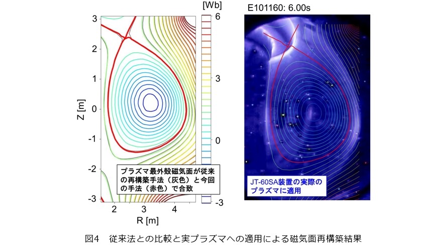 図3は単一のニューラルネットワークで予測した結果と、MoEを用いた予測結果の比較です。単一のネットワークでは、予測(赤の等高線)と正解(黒の等高線)に乖離がみられるのに対し、MoEでは非常によく一致していることが分かります。このMoEによる磁束の再構築手法を、実際の「JT-60SA*7」という装置に適用しました。JT-60SAは、QST那珂フュージョン科学技術研究所にある世界でも最大級のトカマク型核融合実験装置であり、将来の発電炉を見据えて先進的な核融合プラズマの実験が行われています。この装置に取り付けられた磁気センサのデータを入力とし、MoEを使った予測を試した結果、従来の物理モデルと比べても遜色のない精度で、プラズマの位置や形状を再現できることが分かりました。特に、AIによる予測で、プラズマの半径が数mにも及ぶ中で1cm程度の誤差に収まったのは、世界で初めての成果です(図4)。また、これまでは再構築によって主にプラズマの「境界」のかたちを予測していましたが、MoEの応用によって内部の電流や圧力といった「中身」の構造までも予測できる可能性がみえてきました。これにより、不安定性を起こす前に予兆を検出し、事前に制御するという高度な制御方式が実現するかもしれません。