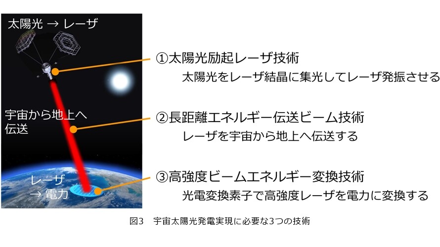 宇宙から地上へレーザ光で電力を送るには、レーザの「波長」の選定が極めて重要です。特に以下の3つの観点が重要となります。