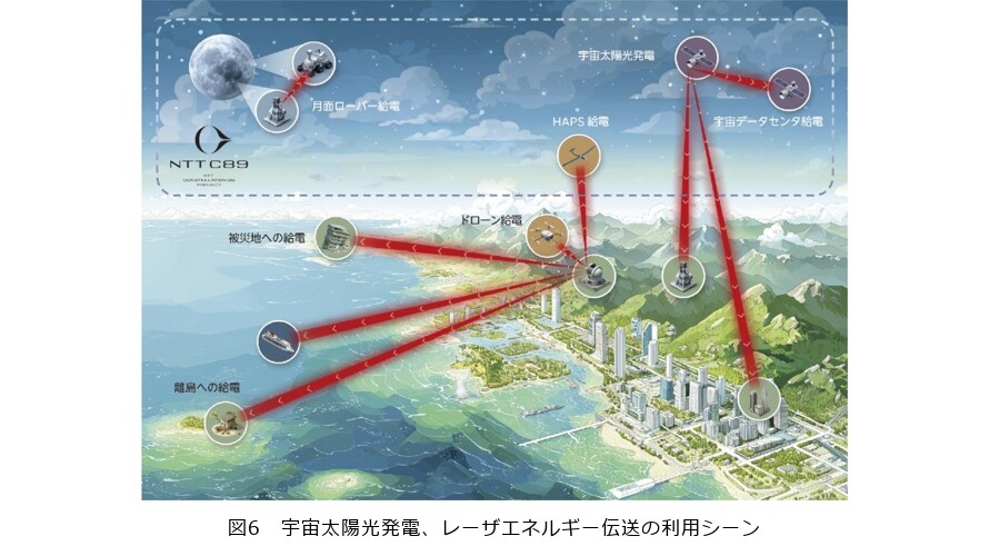 NTT宇宙環境エネルギー研究所では、光電変換素子の技術開発に加え、太陽光励起レーザや長距離エネルギー伝送ビーム技術の研究も並行して進めており、宇宙太陽光発電の実現に向けた研究開発を推進しています。各要素技術の性能向上に加えて、それらを組み合わせた実証実験にも取り組んでいきます。本研究で得られた成果は、宇宙太陽光発電システムにとどまらず、地上におけるレーザ無線給電システムへの応用も期待されています。具体的には、図6に示すように従来電力ケーブルの敷設が困難であった離島や被災地などの遠隔地への電力供給、さらにはドローンや高高度無人機(HAPS)など移動体への無線給電技術としての展開も見込まれます。今後も、私たちは持続可能な社会の実現に向けて、研究開発を加速していきます。