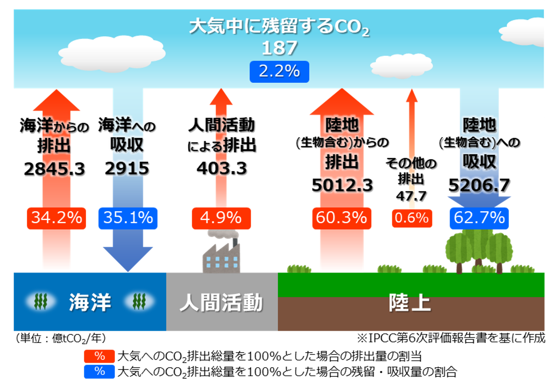 大気中の二酸化炭素は、陸域でグリーンカーボンとして、海洋でブルーカーボンとして生物により吸収されます。