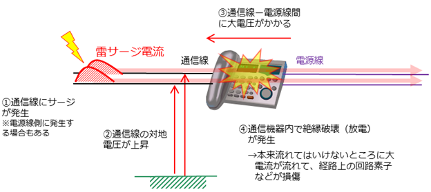 雷サージによる被害の発生メカニズムを見てみましょう。下の図は、通信線に雷サージが侵入した場合に、被害が発生するメカニズムを示しています(ただし、雷サージは電源線側から侵入することもあります)。