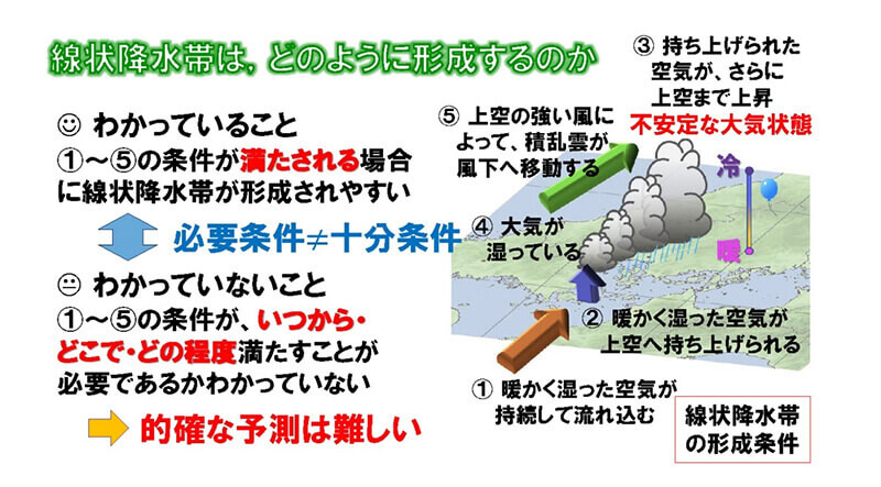 - 最先端の技術を用いても、線状降水帯の予測には多くの課題がある。