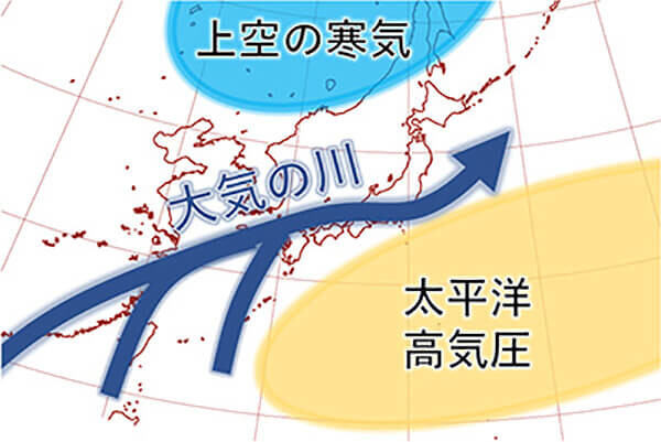 アメリカを中心に研究が進められてきた大気の川は、近年は日本においても西日本や中部地方の暖候期に豪雨をもたらす現象として注目されるようになりました。日本上空では3月から9月にかけて大気の川が発生しやすく、特に梅雨期には南東や南西の海上から水蒸気を多く含んだ大気が、南に張り出した太平洋高気圧に沿って形成された停滞前線に流れ込むことで、大気の川が形成されることが知られています。